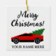 Red Tesla pickup truck with Christmas tree retro Ceramic Ornament . Modern version of old vintage Chevy truck hauling a Christmas tree. Personalized gift for the holidays.