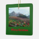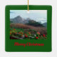 This Christmas ornament fea scenic, rocky 101 California coastal highway scene. Merry red flowers dot the hillside as the vista sweeps into the rocky Pacific coastline, as thunderous waves crash onto huge boulders. This originnal photographe de ce qui marche dans le Near Rocky Point, le South of Carmel-by-the-Sea and Garrapata State Beach along the Cabrillo Highway. The image is in color, with red "Merry Christmas" text, against a green background.