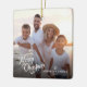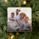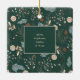 Ce simple ornement photo de Noël présente "Joyeux Noël" dans un élégant script moderne et texte personnalisé pour votre nom de famille. L'arrière offre un motif boho hiver verdoyant apparaissant dans des tans et des teals doux sur un arrière - plan vert turquoise foncé et offre un texte supplémentaire pour les prénoms des membres de votre famille.