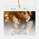 Ce script moderne NOTRE PREMIER NOËL Photo ornament comprend deux de vos photos de fiançailles ou de mariage (à l'avant et à l'arrière) ainsi que vos monogrammes et la date de votre célébration. Ce gardien élégant vous rappellera le jour où vous avez dit OUI pour les décennies à venir.