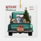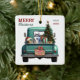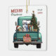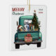 Un pick-up bleu turquoise porte un arbre de Noël décoré et des colis cadeaux sur ce joli ornement de Noël en verre. Vue de la hayon arrière est un beau chien sibérien Husky. Un panneau en bois rustique sur le pare-chocs arrière dit "Cheer de Noël". Le texte stylisé rouge et vert en haut à gauche dit "MERRY CHRISTMAS", avec votre nom (ou celui de votre chien) et l'année à droite. Les deux camps ont la même image.