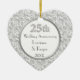 Magnifique ornement en argent à un côté et blanc vingt-cinquième Mariage Anniversaire de gardiennage avec élégante et détaillée bordure en dentelle florale argent. Le dos de l'ornement a assorti le motif de dentelle d'or sur le blanc. Customisez le prénom et le texte de la date avec vos informations. Correspondance d'invitations Anniversaires, autocollants et plus dans mon magasin.