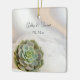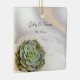 Personnalisez l'élégant Succulent Vert sur Ornement Blanc pour commémorer et se souvenir du jour où vous avez été marié. Créez un cadeau unique d'une faveur de fête, enregistrez la date ou le cadeau de conservation pour la mariée mariée et mariée. Cette élégante décoration de mariage naturel à la coutume présente une numériquement photo florale peinte d'un plante succulent vert avec un voile de mariée blanc et un arrière - plan satiné blanc.