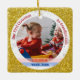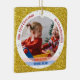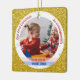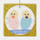 Tendance, élégant et mignon personnalisé First Christmas Twins Baby Girl Ornament pour grands-parents avec un cadre blanc avec des flocons de neige et des étoiles sur un (faux) arrière - plan de parties scintillant doré. L'avant a une ouverture ronde pour une nouvelle fille et bébé garçon et grand-parents personnalisés photo et deux bandes, bleu et rose, sur laquelle apparaissent les noms des nouveau-nés dans une police de script moderne / typographie, et l'autre texte personnalisé, "Notre premier Noël comme grands-parents" Le dos a une image de bébés jumeaux, que vous pouvez garder ou remplacer par une photo, et le texte personnalisable "Premier Noël 202Y" sur une bande bleue.
