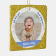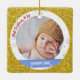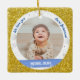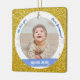 Tendance, élégant et mignon ornement personnalisé Premier Noël pour les garçons jumeaux pour une tante préférée avec un cadre blanc avec des flocons de neige et des étoiles qui a une ouverture ronde pour une photo horizontale personnalisée, et une bande bleue incurvée de chaque côté sur lequel apparaît le nom ou les noms des jumeaux dans une police de script / typographie élégante. Ce design inclut sur le devant les mots "We love you, tante Johanna !", que vous pouvez personnaliser ou supprimer. Sur le dos il y a une autre photo et un texte personnalisé pour l'année du premier Noël des bébés. Avec un cadre extérieur (faux) parties scintillant or.