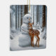 Dans une forêt enneigée, un sympathique bonhomme de neige avec un nez de carotte et un jeune cerf qui s'agite contre lui. Tout le texte peut être modifié.