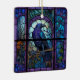 Décoré de vitraux, un corbeau déplaisant éffrayant tourne son regard vers le spectateur.