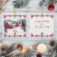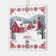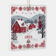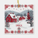 Cet ornement festif et nostalgique présente un village enneigé dans un style nordique ou scandinave. Les couleurs sont le rouge, le blanc, le gris et le noir. Il peut être customisé d'un an ou d'un autre texte sur le devant, d'un message d'accueil et d'un texte supplémentaire sur le dos.