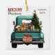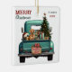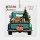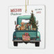 Un pick-up bleu turquoise porte un arbre de Noël décoré et des colis cadeaux sur ce joli ornement de Noël en verre. Vue de la porte arrière est un beau chien rouge Vizsla. Un panneau en bois rustique sur le pare-chocs arrière dit "Cheer de Noël". Le texte stylisé rouge et vert en haut à gauche dit "MERRY CHRISTMAS", avec votre nom (ou celui de votre chien) et l'année à droite. Les deux camps ont la même image.