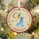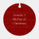 Réjouissez-vous du 9e jour de Noël avec cet élégant ornement « Neuf dames dansant » de la collection Les Douze (12) Jours de Noël. Le design présente une gracieuse dame dans une robe bleue fluide en plein danse à côté d'un grand « 9 » doré scintillant, symbolisant la joie et la célébration. Le fond de partition de musique au papier parchemin légèrement décoloré apporte une touche de charme vintage, tandis qu'une bordure circulaire rouge encadre la scène. En arc au-dessus est inscrite la ligne du chant de Noël, « Le 9e jour de Noël mon véritable amour m'a donné », avec « neuf dames dansant » qui courbe le long du bas. De minuscules poires dorées de chaque côté unissent le design au reste de la série.