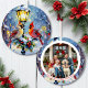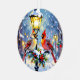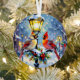 A beautiful Christmas ornament with an impasto style ai illustration of a female and male cardinal sitting on a lamppost on a snowy winter night. A back drop of a cute festive street and village. On the back of the ornament you can add your own custom message and family photo in the personalize area.