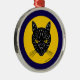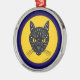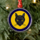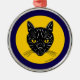 A retro-looking illustration of the face of a yellow-eyed black cat appears in a moon-like circle in this original Halloween-appropriate art by Richard H. Fay.