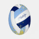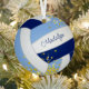 Ce joli ornement de volley-ball présente l'image réaliste d'un volley-ball qui a des panneaux bleu et blanc clair et foncé et un arrosage de minuscules étoiles de faux parties scintillant or, sur lequel vous pouvez customiser le nom du joueur sur le devant et l'année commémorative sur le dos - par katz_d_zynes