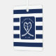 Ornement de Noël bleu marine et blanc rayé. Idéal pour une décoration d'arbre de Noël de maison de lac ou de marine (militaire). Le design présente une corde en forme de cœur avec une ancre et les initiales d'un couple au milieu. Personnalisez-le avec vos détails.
