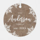 Les ornements personnalisés de la famille de Noël comprennent un élégant script de nom de famille branché et des flocons de neige sur arrière - plan de burlap rustique, photo de famille optionnelle sur le dos, moderne et simple.