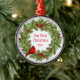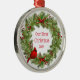 This ornament is shown with a festive Christmas holiday berry wreath and cardinal bird print.