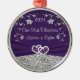 Cet ornement métallique commémoratif personnalisé et romantique de votre premier Noël ensemble en tant que couple marié est sûr d'être un rappel annuel de votre jour de mariage et de l'union que vous avez faite. La zone de conception de l'ornement métallique rond comporte un ruban violet et une image de cœurs unis sur le fond. Il y a une couleur de fond violette principale qui a des arches florales argentées au-dessus du ruban avec un effet d'argent simule en dessous du ruban. Les mots "Notre premier Noël" sont imprimés dans la même police de caractères que celle utilisée sur toutes les pièces assorties de l'ensemble de mariage. Les noms du couple heureux et l'année du 1er Noël de mariage sont imprimés en gris. Cela ferait également une surprise charmante pour le couple s'il est offert en cadeau lors d'une douche de mariage ou de noces. Si vous avez besoin d'autres articles assortis, veuillez envoyer un courriel à niteowlstudio@gmail.com et surveiller vos