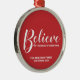 Red and White Modern Holiday Ornament a pour titre 'Believe' en blanc style de police de script moderne avec détails en blanc style de police sans serif moderne sur rouge arrière - plan.
