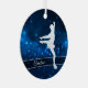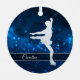 Cet élégant ornement présente une patinoire féminine silhouette argentée contre un joli arrière - plan bleu avec de minuscules lampes étoilées. Son nom est en argent sur une bannière semi-transparente encadrée d'une fausse parties scintillant blanche. L'arrière de l'ornement a le même arrière - plan bleu avec trois champs de texte personnalisés au centre. Parfait pour cette fille, petite-fille ou nièce qui est un patineur.