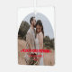 Élégant minimal moderne | Noël Couple Photo Ornament en Métal. Un ornement moderne et élégant de vacances photo avec votre nom de famille présenté dans la typographie classique associé avec écriture manuscrite en blanc sur votre photo grandeur. Votre photo spéciale sera magnifique dans ce design unique, moderne et minimal. Un design élégant et minimaliste pour se démarquer de la foule en cette saison de noël ! L'image montrée n'est à des fins d'illustration que pour être remplacée par votre propre photo. L'image de l'espace réservé est celle d'un joyeux jeune couple assis ensemble devant un champ ouvert.