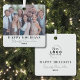 Répandez des vacances de joie avec cet élégant ornement de Noël d'entreprise, parfait comme un souvenir promotionnel pour les clients. Le rectangle blanc au fond est propre, idéal pour afficher son message festif à côté d'une photo du personnel. Le dos comprend le logo de votre entreprise, en ajoutant une touche professionnelle. Le design associe des polices serif audacieuses à l'écriture manuscrite de script pour un look sophistiqué. Deux espaces photo personnalisables mettent en valeur votre équipe, avec un lavage blanc transparent ajoutant une sensation éthérée. Pour un look plus brillant, il suffit de retirer les couches blanches de l'éditeur.Entreprise Noir et blanc Affaires Noël Métal Ornament Logo Personnel Photo Keepsaké promotionnel