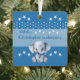 Ornement métallique recto verso. Une idée cadeau pour un nouveau bébé, avec un éléphant mignon, des étoiles et des pois. Personnalisez avec un nom / shhh 'nom de bébé' est en train de dormir. L'expression "Sweet Dreams" est à l'arrière. Bleu et blanc.