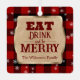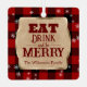 Ces ornements de vacances personnalisés ont un thème festif de Noël. L'arrière - plan dispose d'un motif de plaid de Buffalo rouge rustique parsemé de flocons de neige. Une affiche vintage en papier parchemin est imprimée au centre et encadrée d'une bordure en feuille d'or. L'expression "Mangez Boire et Soyez Joyeux" est imprimée en haut dans une police rouge bordeaux, suivie d'un exemple de nom de famille. Vous pouvez personnaliser l'ornement pour inclure votre propre nom personnalisé ou un autre texte.