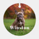 Modern Custom Name Photo Holiday metal ornament with your pet’s name in a bold white serif font.