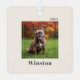 Modern Ivory Custom Name Photo metal ornament with your pet’s name in a gray, bold serif font. Your pet's photo is framed with a thin white line on an elegant ivory background.