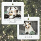 Cet ornement de Noël carré simple et élégant est une façon charmante de célébrer la première saison des fêtes de votre chiot ou animal de compagnie. Le design comporte un espace pour une photo sur le devant et une autre au dos, ce qui en fait un objet de souvenir double face rempli de souvenirs adorables. "Mon premier Noël" est affiché sous la photo du devant dans une police serif classique, avec le nom de votre animal de compagnie écrit en dessous dans une écriture douce pour un effet personnel. Si vous célébrez plus d'un animal de compagnie, vous pouvez facilement modifier le texte pour dire "Notre premier Noël" à la place.