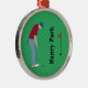 Un golfeur vert personnalisé, portant un casquette, une chemise rouge profonde et un pantalon bleu, mettant une balle de golf dans un ornement de Noël.
