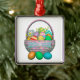 Des ornements métalliques suspendus avec mon design d'oeufs colorés peints de Pâques dans un joli panier avec le texte qui dit "Bonne Pâques".