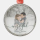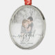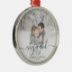 Commémorez votre fiançailles avec ce magnifique ornement de gardien moderne. Le texte vert dit "Notre premier Noël engagé", avec le mot "engagé" dans un élégant script d'écriture manuscrite avec des fioritures avant et après. Remplacez l'exemple d'image par votre photo préférée, et ajoutez vos noms et l'année. Un filtre dégradé blanc permet de faire apparaître le texte.