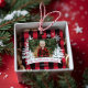 Ferme rustique arbres de Noël frais photo de famille gardien de saké ornement métal. L'ornement peut être customisé avec le nom de famille, l'année, et la photo. Arrière - plan en damier rouge avec pins rustiques et flocons de neige. Le nom de famille est affiché dans une bannière blanche. Oeuvre de Moodthology Papery.