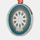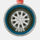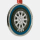 Photographie de roue automobile sur arrière - plan vert. avec date imprimée sur le bas du pneu.