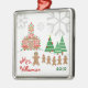 Un ornement de Noël d'amusement pour des professeurs comportant une scène de neige d'école avec l'école de pain d'épice, le professeur de pain d'épice, et les étudiants de pain d'épice dans la neige a couvert la cour de récréation. Les arbres d'arbre et d'arbre de Noël ont épousseté avec la neige à la droite de l'école. Flocons de neige en haut. Personnalisez avec le nom et l'année de votre professeur.