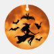 Silhouettes de sorcière et de chauves-souris sur une lune jaune et orange.