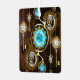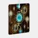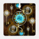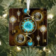 Turquoise lenses with antique watch with brass gears and golden keys on rusty, brown background. Steampunk style.