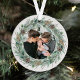 Elégant "Joyeux Noël" en métal rond décor de vacances photo ornement avec un chic rustique arrière - plan de grains de bois blanc avec une couronne de verdure d'hiver aquarelle encadrant le tableau de famille. Personnalisez le texte moderne et élégant vert et gris charbon de bois avec votre choix de salutation, nom de famille, et l'année.