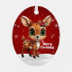 Whimsical Baby Deer Snowy Christmas Berry Red Ornament. Featuring an adorable cartoon graphic of a cute fawn standing on snow-covered ground, with a light sprinkle of sparkles that mimic gently falling snow against a vibrant berry red background. Tucked behind its ear are delicate poinsettia flowers, evoking a winter woodland wonderland perfect for the festive season. This personalizable Xmas floral fawn decoration is ideal for hanging on your Xmas tree or as tags for presents, bringing joy to every corner of your home. This cute two-sided illustration can be easily customized by adding your personal messages or names to either side! Makes a cherished keepsake for years to come. This lovely custom doe lover decor will make a wonderful gift for every member of your family! Customize by changing the white "Merry Christmas" text, font, color, or delete it entirely. You can even transfer this design onto other products for endless creativity.