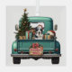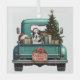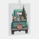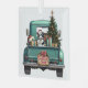 Un pick-up bleu turquoise transporte un arbre de Noël décoré et des colis cadeaux sur ce joli ornement de Noël en verre. A côté de l'arbre se trouve un très beau tricolore australien Shepherd Dog portant un casquette du Père Noël rouge et blanc. Un panneau en bois rustique sur le pare-chocs arrière dit "Cheer de Noël".