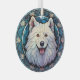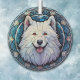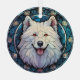 Voici un joli ornement en verre avec un thème de vitrail, avec un joli chien blanc Samoyed. Le chien est dressé contre un arrière - plan en mosaïque bleue. Cela fait un bon rembourrage ou décoration pour la maison qui aime un Samoyed.