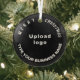 Joyeux Noël! Ornement en verre avec des textes de voeux de Noël Joyeux, votre nom d'entreprise ou de compagnie et logo. Les dessins sont des textes blancs sur arrière - plan noir et en forme de cercle. Ornement pour décorer le sapin de Noël dans votre magasin, magasin ou bureau. Ornement pour accueillir visuellement vos clients cette saison de vacances et pour annoncer votre entreprise ou promouvoir votre marque. Customisez-le et utilisez-le pour sensibiliser la marque. Veuillez vérifier l'apparence après avoir téléchargé le logo et tapé votre nom d'entreprise. Si l'apparence vous plaît, vous pouvez passer votre commande maintenant. Si vous avez besoin de redimensionner et déplacer le logo et les textes pour s'adapter à cet ornement ou à d'autres styles que vous choisirez, s'il vous plaît changer dans l'outil de conception. Vous pouvez également effectuer d'autres modifications selon vos préférences dans l'outil de conception, comme changer la couleur de l'ornement, la couleur de police et le style de police. Joyeux Noël! Je vous souhaite plus de ventes cette saison des Fêtes.