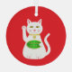 Ce magnifique ornement de Noël en verre présente une image graphique d'un chat oriental blanc qui a de la chance. Le chat a de beaux yeux dorés et porte un médaillon d'or sur le collier autour du cou. Le chat a des oreilles roses et des chuchotements. Ce mignon petit chaton tient un jeton doré avec une incrustation de jade verte et un message en texte doré qui dit "Bonne chance".