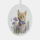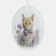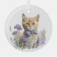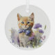 Ornement d'arbre de Noël doux, avec aquarelle d'un chaton tabby orange, avec une cravate arc violet et assis dans un lit ou des fleurs violettes. Belle idée cadeau pour n'importe quel amoureux des chats.