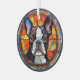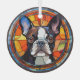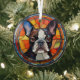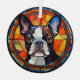 Voici un joli ornement en verre avec un thème de vitrail, avec un adorable chien de Boston Terrier noir et blanc. Le chien est dressé contre un arrière - plan en mosaïque orange et or aux bordures bleues et dorées. Cela fait un bon rembourrage ou décoration pour la maison qui aime un Boston Terrier.