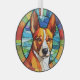 Voici un joli ornement en verre avec un thème de vitrail, avec un beau chien Basenji. Le chien est d'or et de blanc brillant, et dressé contre un arrière - plan abstrait à dominante bleue avec une bordure multicolore. Cela fait un bon pochette ou une décoration pour la maison qui aime un Basenji.