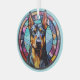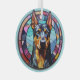 Voici un joli ornement en verre avec un thème de vitrail, avec un beau chien Doberman Pinscher. Le chien est dressé contre un arrière - plan en mosaïque multicolore. Les couleurs sont le bleu, l'or, le rouge marron et le rose lavande. Cela fait un bon pochette ou décoration pour la maison qui aime un majestueux Doberman.
