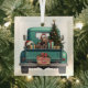 Un pick-up bleu turquoise transporte un arbre de Noël décoré et des colis cadeaux sur ce joli ornement de Noël en verre. À côté de l'arbre se trouve un beau chien de Labrador Retriever brun chocolat portant un casquette de père Noël rouge et blanc. Un panneau en bois rustique sur le pare-chocs arrière dit "Cheer de Noël".
