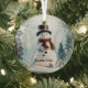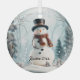 Voici un gros plan d'une illustration d'un bonhomme de neige heureux par un pays merveilleux d'hiver dans un globe de neige.
